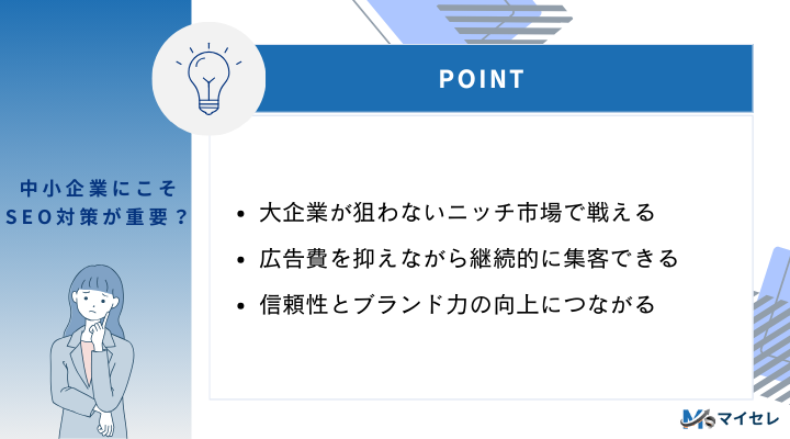中小企業がSEOに取り組むメリットは、実は大企業よりも大きいケースが多くあります。その理由は大きく3つあります。