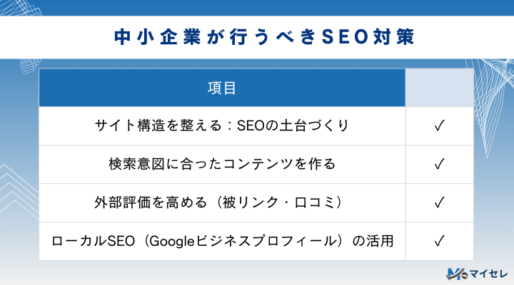 中小企業がまず取り組むべきSEOは「サイト構造」「コンテンツSEO」「外部評価(被リンク・口コミ)」の3つです。