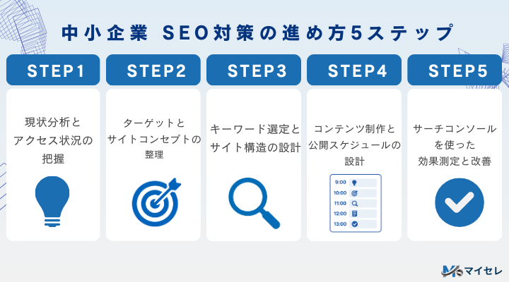ここからは、中小企業が実際にSEOを進めていくための具体的なステップを5段階で解説します。順番どおりに進めることで、無駄な作業を減らし、成果に直結しやすい形で取り組めます。