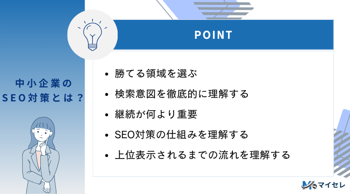 中小企業のSEO成功ポイントは、「勝てる領域を選ぶ」「検索意図を満たす」「改善を継続する」の3つに集約されます。特別なテクニックよりも、読者と検索エンジンの両方にとって分かりやすく誠実なサイトをコツコツ育てていくことが、最終的にもっとも大きな成果につながります。